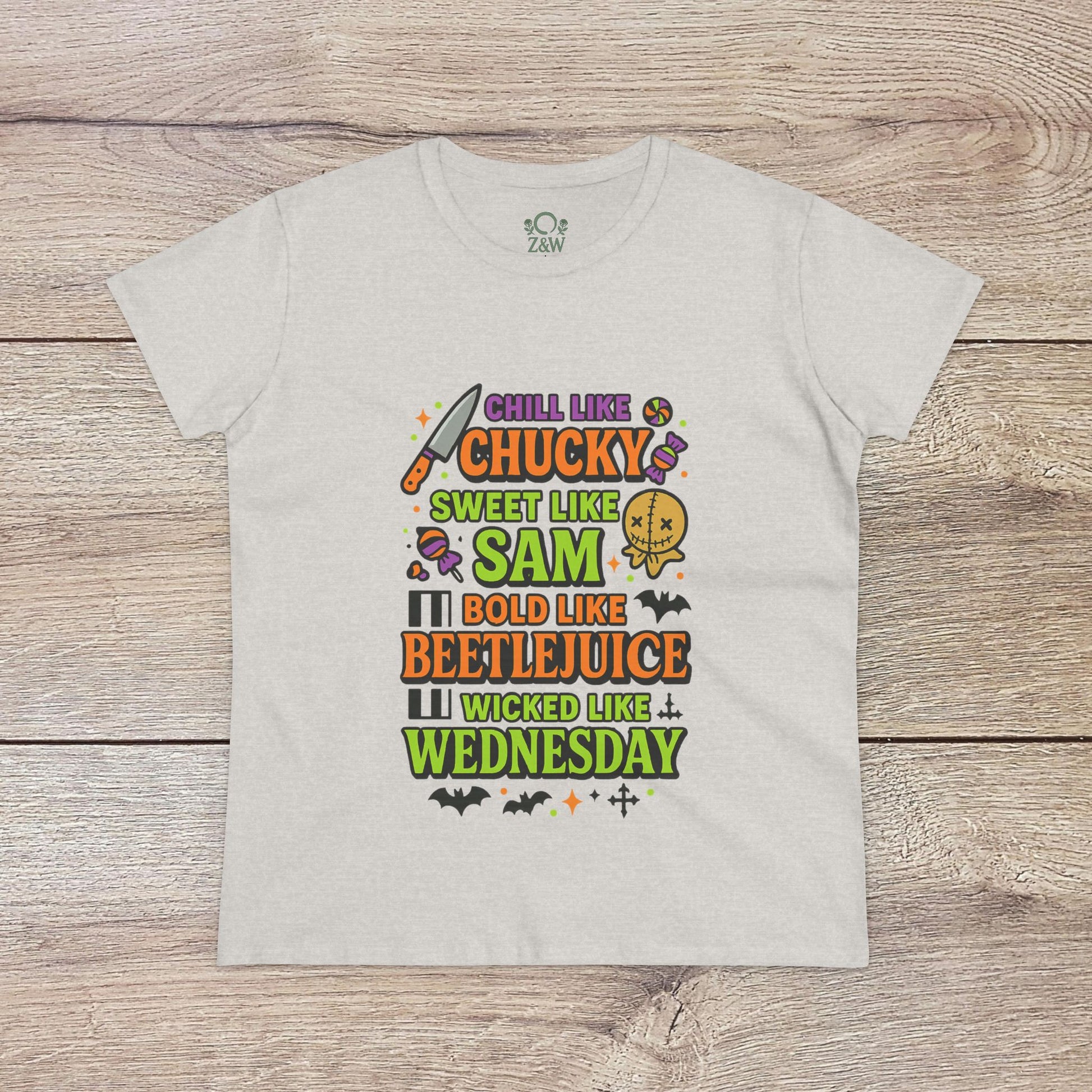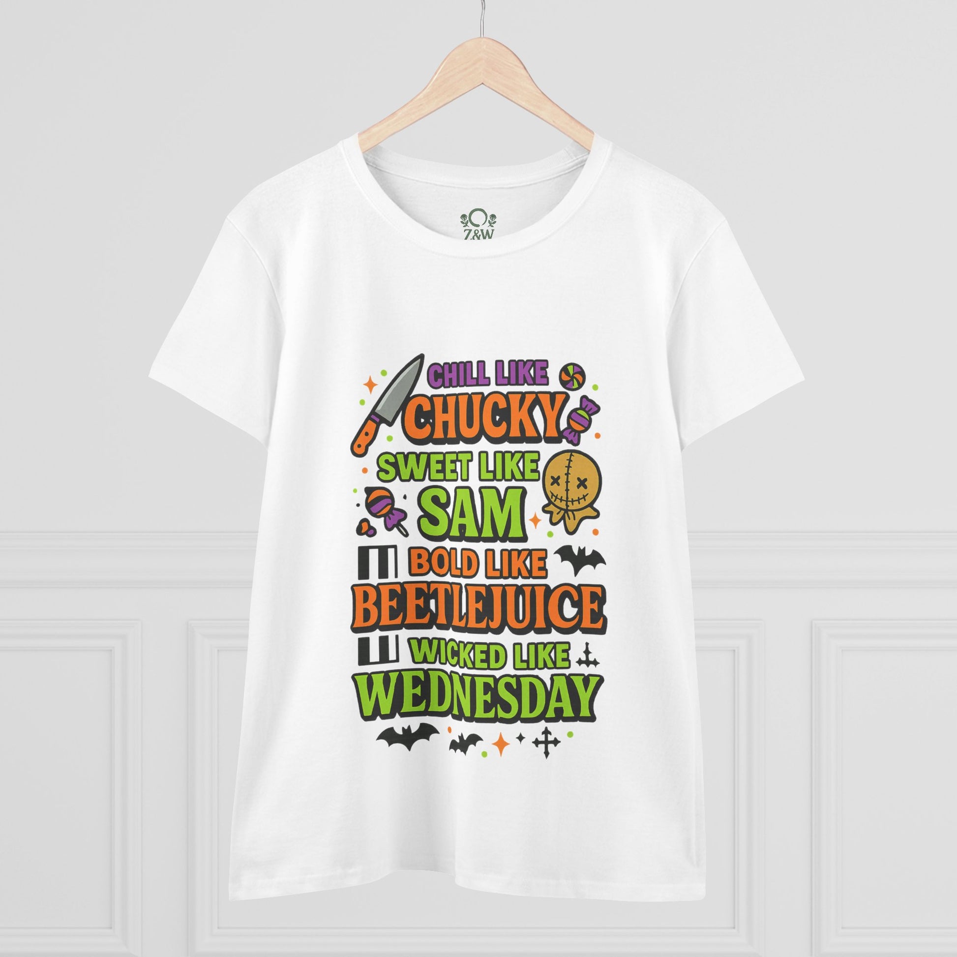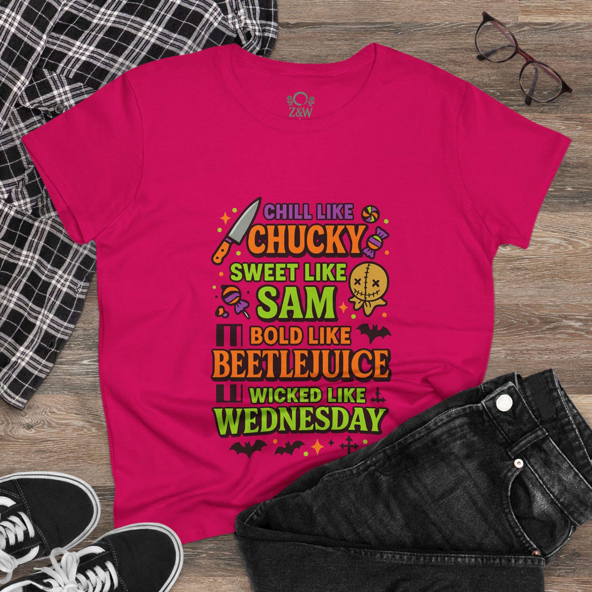 Spooktacular Horror Tee: Chill Like Chucky, Sweet Like Sam, Beetlejuice, Wednesday Addams, Halloween Shirt, Horror Fan Gift